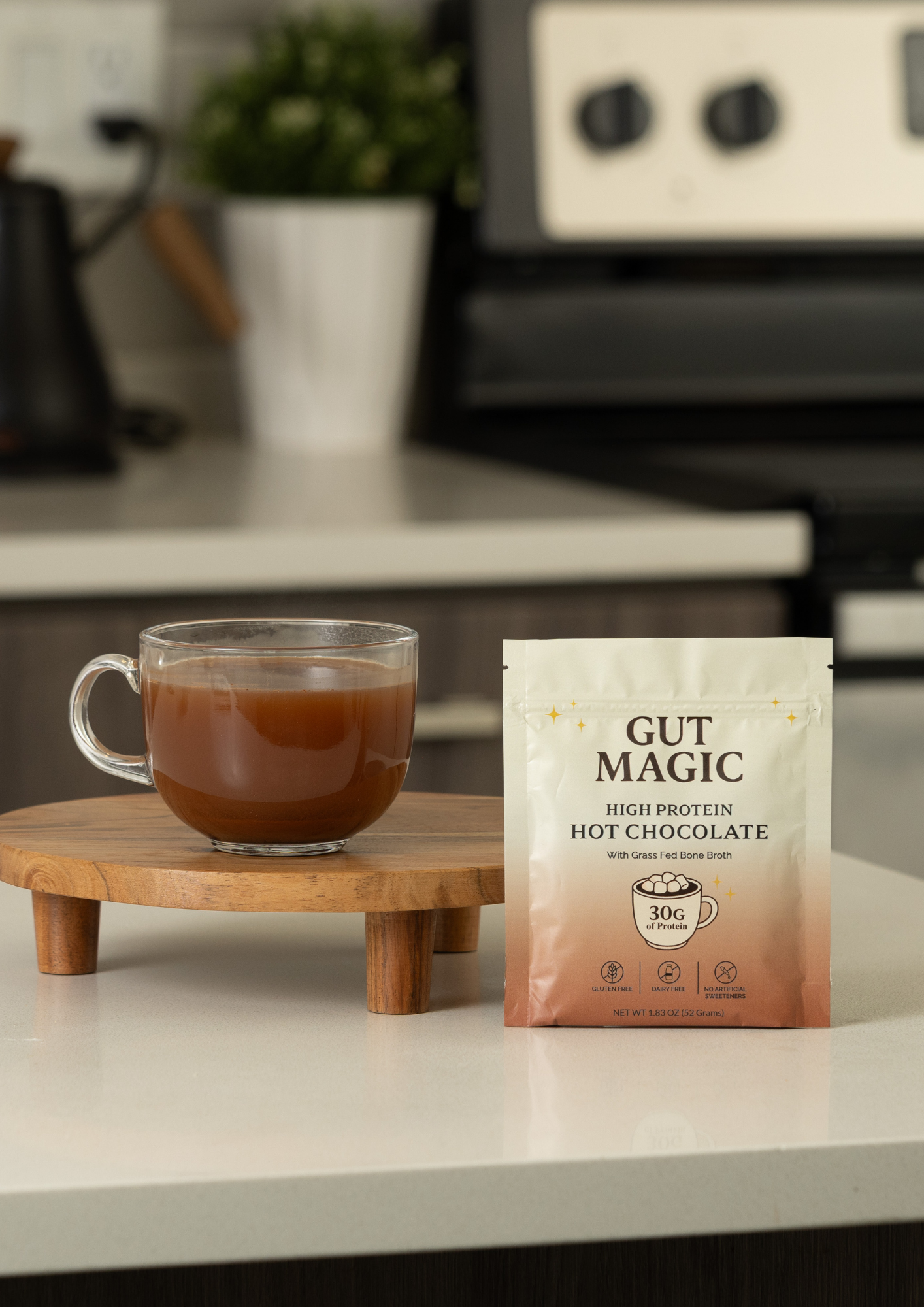 Gut Magic is where wellness meets pleasure — a daily ritual that fuels your body, supports yur gut health, uplifts your mood, and satisfies your senses. Crafted by a gut health dietitian, our full-spectrum bone broth elixir blends the nutrient density your body craves with the indulgent flavors you adore. No fillers. No artificial anything. Just whole foods, real flavor and pure magic.